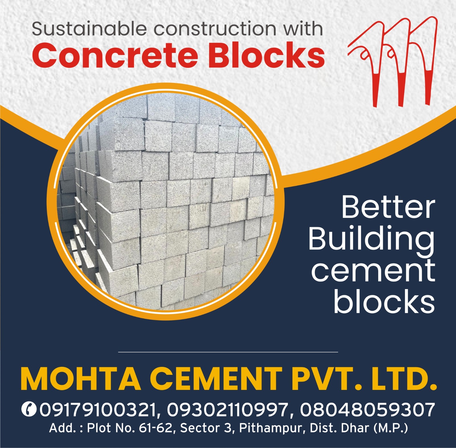 Looking to build a solid foundation for your construction project? Look no further than Mohta Cement Pvt Ltd. being as Manufacturer of solid concrete blocks in Indore, We're delighted to serve you in such locations like Bhopal, Pithampur, Dewas, Khandwa, and Indore, as well as the surrounding areas. We are a leading manufacturer and supplier of high-quality concrete blocks that are designed to meet the demanding needs of modern construction. Our blocks are crafted using premium-grade cement, sand, and aggregates, ensuring exceptional durability, strength, and longevity. Whether you're building a residential home, commercial building, or industrial facility, our concrete blocks offer a reliable and cost-effective solution. With our commitment to quality and customer satisfaction, you can trust Mohta Cement Pvt Ltd to provide the essential building materials for your project.